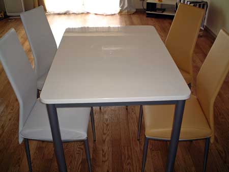 当初、オサレなガラス天板のを買おうかと思っていたが、家具屋で店員に説明を聞いてるうちに気が変わった。 ちなみに椅子は、白、黒、赤、黄の4色が選べたわけだが、暖色系の方が食欲はそそる理論と、 |