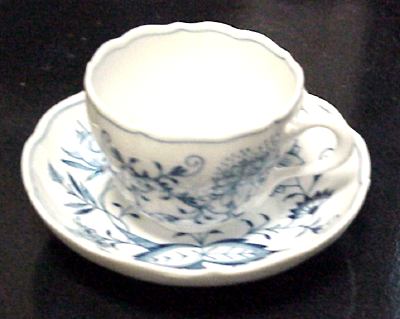 我々はそのセカンド品に的を絞り市内中のアンティークショップを荒し回った果てに見つけたのがこの「ブルーオニオン」と呼ばれる柄のカップとソーサーである。